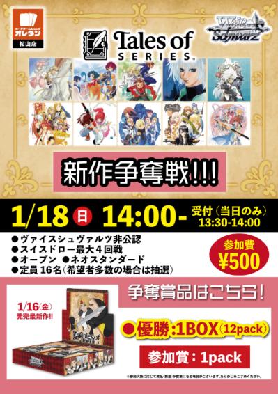 新作争奪戦「[テイルズ オブ]シリーズ」 大会概要 非公認 TGC名 ヴァイスシュヴァルツ 大会名 新作争奪戦「[テイルズ オブ]シリーズ」 開催日時 2026年01月18日(日) 14:00〜 開催店 オレタン松山店 クラス オープン レギュレーション ネオスタンダード 参加費 500円 定員 16人