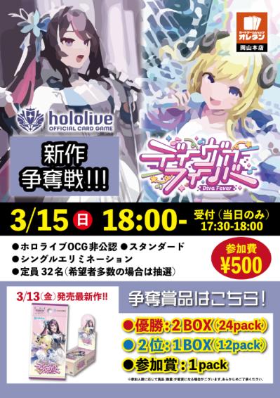 新作争奪戦「ディーヴァフィーバー」(シングルエリミネーション) 大会概要 非公認 TGC名 ホロライブOCG 大会名 新作争奪戦「ディーヴァフィーバー」(シングルエリミネーション) 開催日時 2026年03月15日(日) 18:00〜 開催店 オレタン岡山本店 クラス オープン レギュレーション スタンダード 参加費 500円 定員 32人