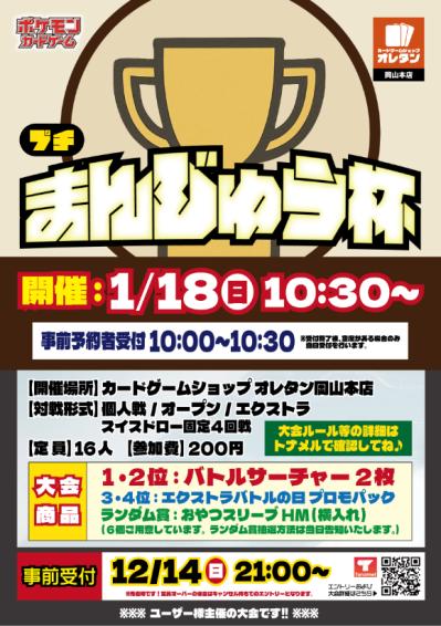 プチまんじゅう杯#1 ※トナメルにて事前受付 大会概要 非公認 TGC名 ポケモンカードゲーム 大会名 プチまんじゅう杯#1 ※トナメルにて事前受付 開催日時 2026年01月18日(日) 10:30〜 開催店 オレタン岡山本店 クラス オープン レギュレーション エクストラ 参加費 200円 定員 16人