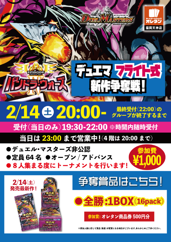 デュエマフライト式新作争奪戦 ※8人揃い次第行うトーナメント戦(受付:20:00~22:30) 大会概要 非公認 TGC名 デュエル・マスターズ 大会名 デュエマフライト式新作争奪戦 ※8人揃い次第行うトーナメント戦(受付:20:00~22:30) 開催日時 2026年02月14日(土) 20:00〜 開催店 オレタン福岡天神店 クラス オープン レギュレーション アドバンス 参加費 1,000円 定員 64人