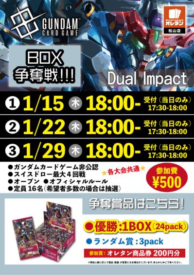 「Dual Impact」BOX争奪戦 大会概要 非公認 TGC名 ガンダムカードゲーム 大会名 「Dual Impact」BOX争奪戦 開催日時 2026年01月22日(木) 18:00〜 開催店 オレタン松山店 クラス オープン レギュレーション オフィシャルルール 参加費 500円 定員 16人