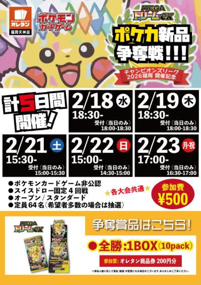 CL福岡開催記念ポケカ新品争奪戦(固定4回戦) 大会概要 非公認 TGC名 ポケモンカードゲーム 大会名 CL福岡開催記念ポケカ新品争奪戦(固定4回戦) 開催日時 2026年02月23日(月) 17:00〜 開催店 オレタン福岡天神店 クラス オープン レギュレーション スタンダード 参加費 500円 定員 64人
