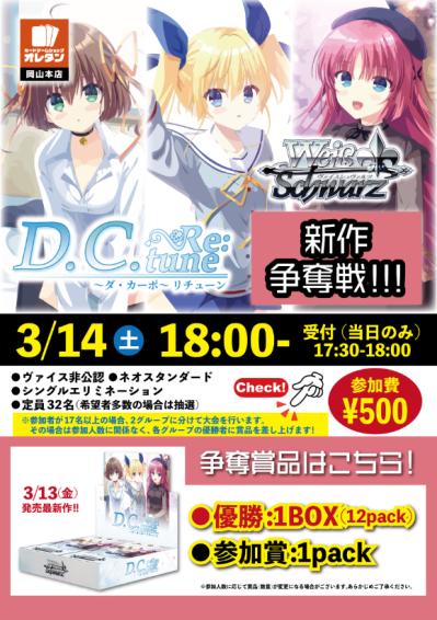 新作争奪戦「D.C. Re:tune ~ダ・カーポ~ リチューン」(シングルエリミネーション) 大会概要 非公認 TGC名 ヴァイスシュヴァルツ 大会名 新作争奪戦「D.C. Re:tune ~ダ・カーポ~ リチューン」(シングルエリミネーション) 開催日時 2026年03月14日(土) 18:00〜 開催店 オレタン岡山本店 クラス オープン レギュレーション ネオスタンダード 参加費 500円 定員 32人