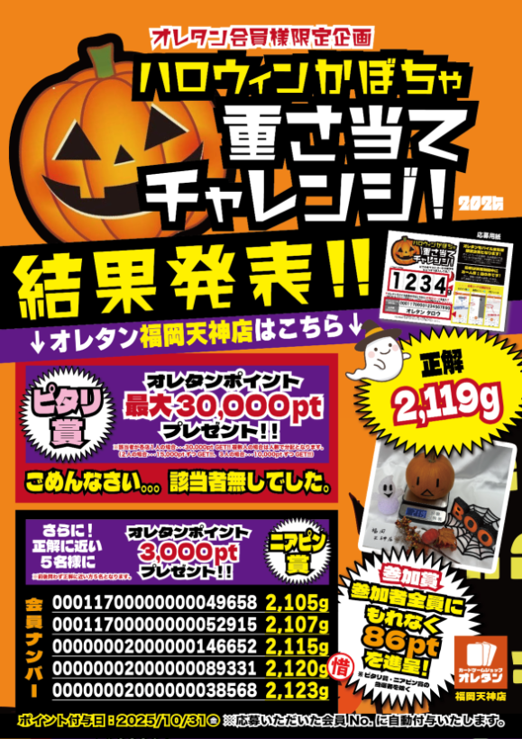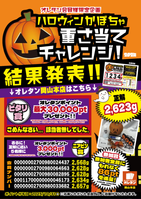 【全店】ハロウィン2025「かぼちゃ重さ当てチャレンジ!」結果発表♩