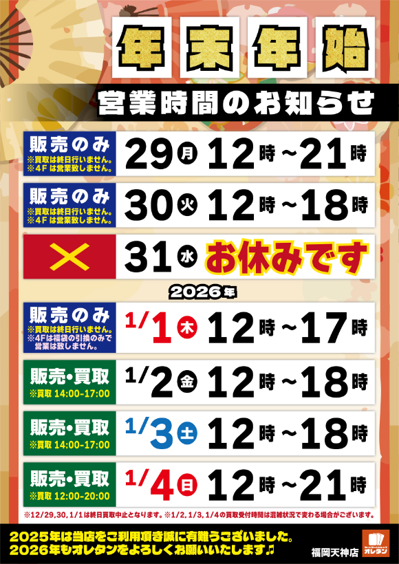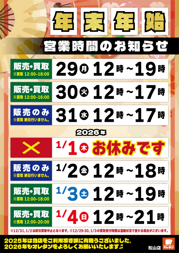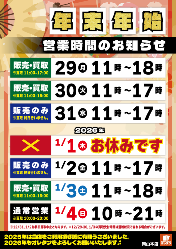 ★★★ 年末年始営業時間のお知らせ ★★★