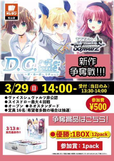 新作争奪戦「D.C.Re:tune~ダ・カーポ~リチューン」 大会概要 非公認 TGC名 ヴァイスシュヴァルツ 大会名 新作争奪戦「D.C.Re:tune~ダ・カーポ~リチューン」 開催日時 2026年03月29日(日) 14:00〜 開催店 オレタン松山店 クラス オープン レギュレーション ネオスタンダード 参加費 500円 定員 16人
