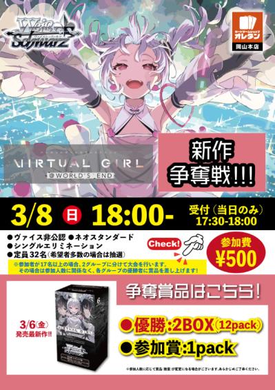 新作争奪戦「VIRTUAL GIRL @ WORLD’S END」(シングルエリミネーション) 大会概要 非公認 TGC名 ヴァイスシュヴァルツ 大会名 新作争奪戦「VIRTUAL GIRL @ WORLD’S END」(シングルエリミネーション) 開催日時 2026年03月08日(日) 18:00〜 開催店 オレタン岡山本店 クラス オープン レギュレーション ネオスタンダード 参加費 500円 定員 32人