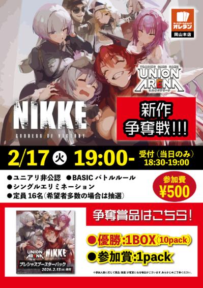 新作争奪戦「勝利の女神:NIKKE」(シングルエリミネーション) 大会概要 非公認 TGC名 ユニオンアリーナ 大会名 新作争奪戦「勝利の女神:NIKKE」(シングルエリミネーション) 開催日時 2026年02月17日(火) 19:00〜 開催店 オレタン岡山本店 クラス オープン レギュレーション BASICバトルルール 参加費 500円 定員 16人